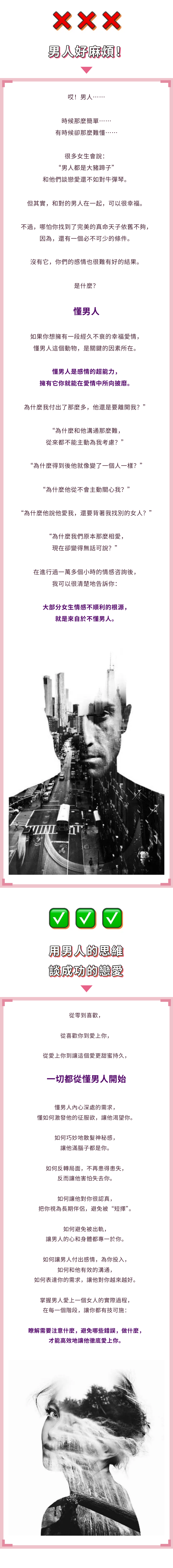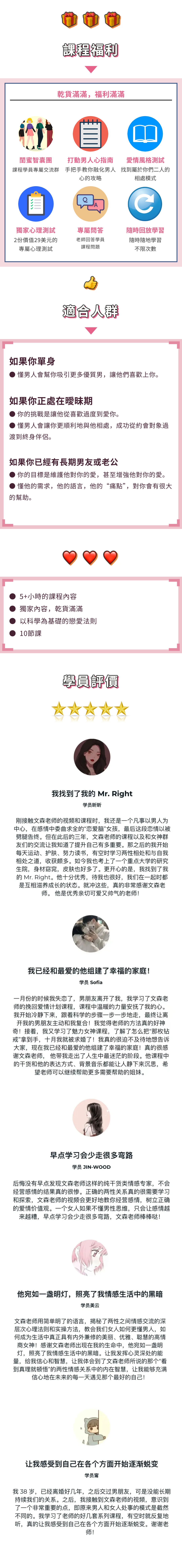 與男人戀愛,最有效的相處模式是什麼?在一段關係中,男人最渴望的是什麼?如何讓他為你神魂顛倒?在《讀懂男人心》課程里,老師為你揭秘那些男人心照不宣的秘密,讓你抓住男人心理的10個弱點,輕鬆把他牢牢吃定。 瞭解男人才能真正走進男人心,才能讓他徹底地愛上你。用男人的思維談戀愛,成為世上最懂他的女人。