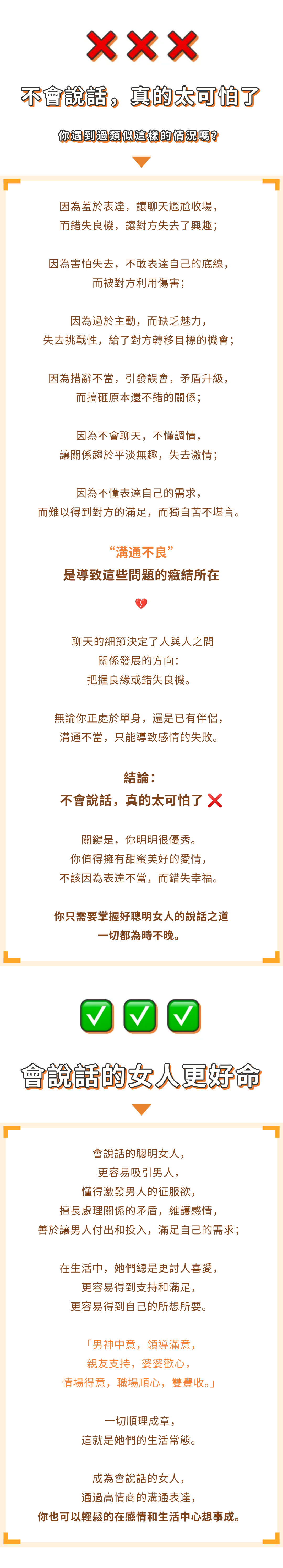 會說話的聰明女人,更容易吸引男人, 懂得激發男人的征服欲, 擅長處理關係的矛盾,維護感情, 善於讓男人付出和投入,滿足自己的需求; 在生活中,她們總是更討人喜愛, 更容易得到支持和滿足, 更容易得到自己的所想所要。 「男神中意,領導滿意, 親友支持,婆婆歡心, 情場得意,職場順心,雙豐收。」 一切順理成章, 這就是她們的生活常態。 會說話的女人最好命, 通過高情商的溝通表達, 你也可以輕鬆的在感情和生活中心想事成。